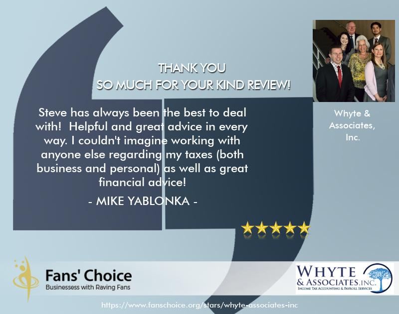 Its always a pleasure to work with Whyte & Associates. I get good solid feedback and service with a smile always! They keep me in line so I am not faced with a surprise bill at the filing deadline and always seem to get some money back into my pocket! Thanks !